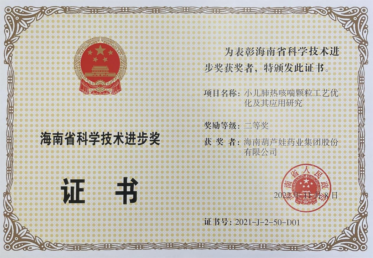 11月15日,海南省科学技术奖励大会在海口召开,揭晓了2021年度海南省科学技术奖。海南IM电竞药业集团股份有限公司凭借“小儿肺热咳喘颗粒工艺优化及其应用研究”,荣获海南省科学技术进步奖二等奖。项目主要完成人有刘景萍、刘全国、胡俊斌、李培湖、刘萍、王家、陈克领、何彦博。