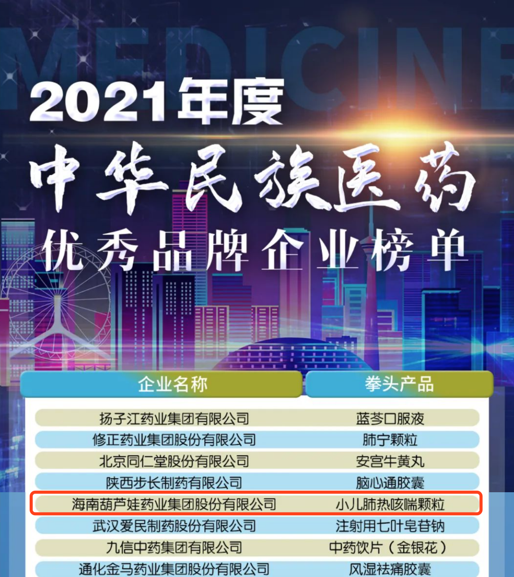 12月29日,全国工商联医药业商会发布了“2021年度中华民族医药优秀品牌企业榜单”,IM电竞药业集团凭借黄金单品小儿肺热咳喘颗粒(4克)实力登榜。